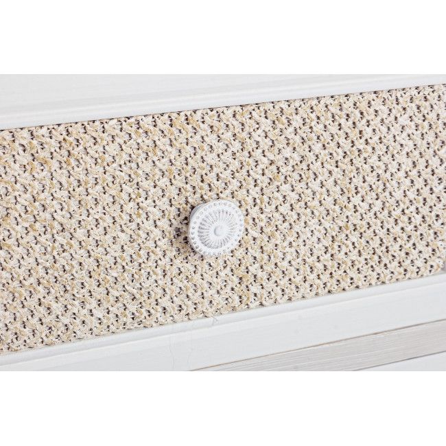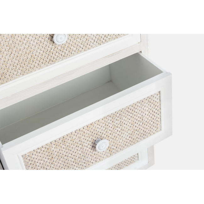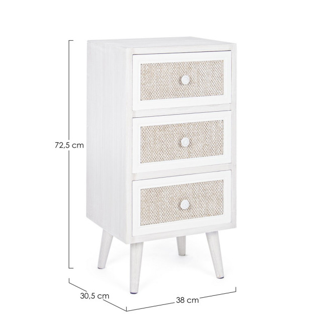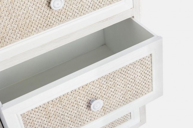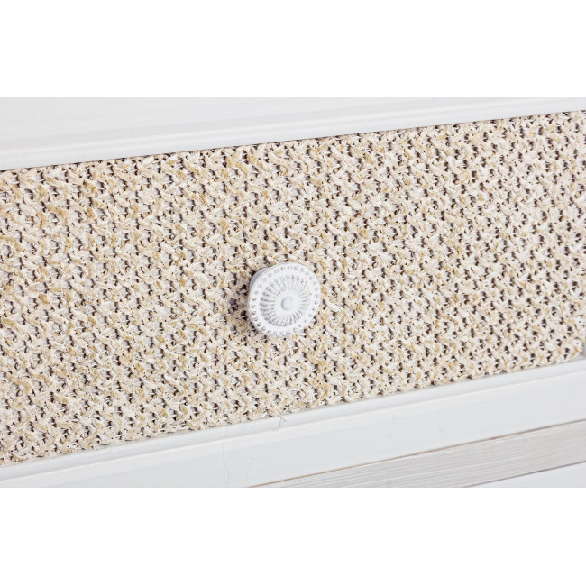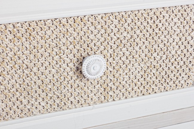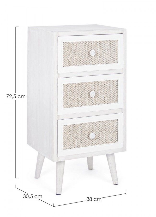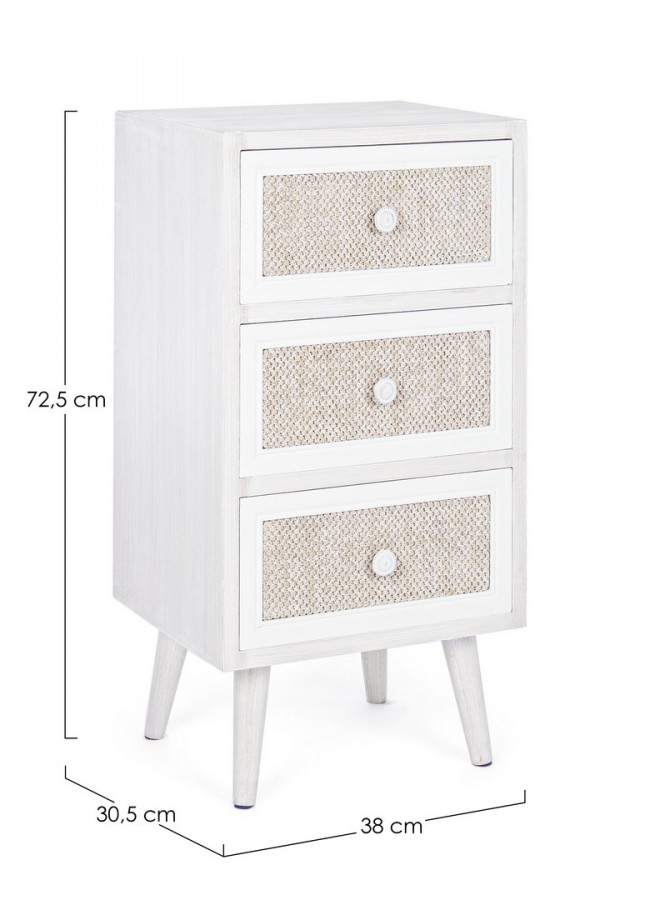 MDF. FRONTALE CASSETTO RIVESTITO IN TESSUTO (COTONE/LINO). FINITURA CON VERNICE A BASE D’ACQUA. POMELLI IN METALLO. PIEDINI DA ASSEMBLARE.