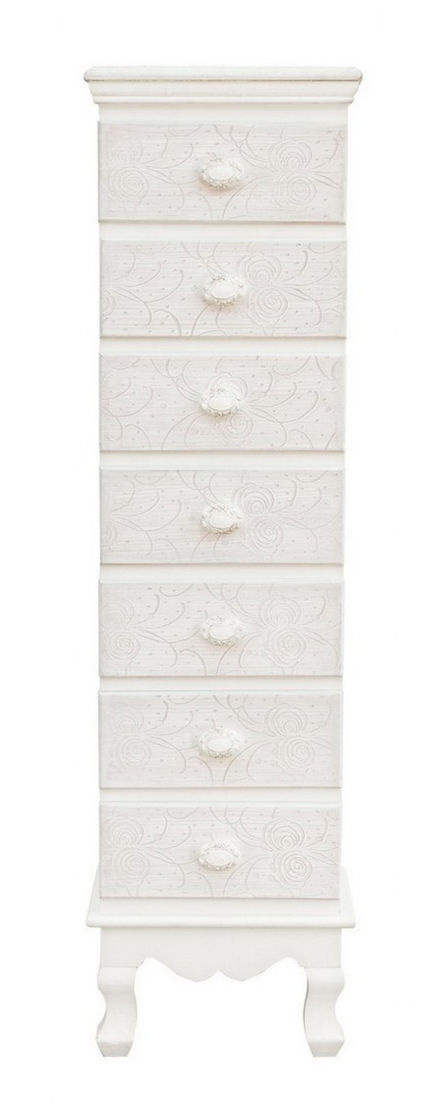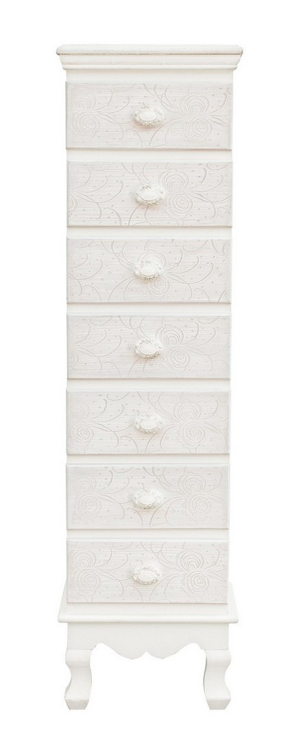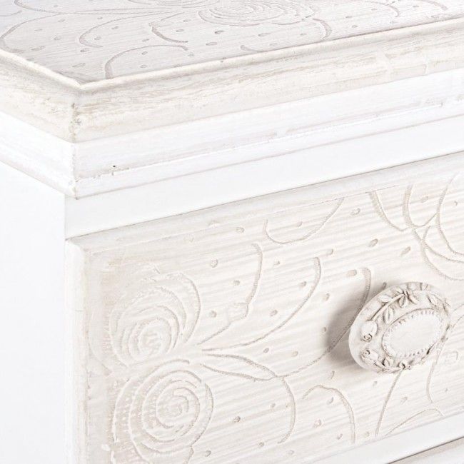 MDF. RIPIANI E FRONTALI CON MOTIVI FLOREALI INTARSIATI. RIFINITURA CON VERNICE OPACA A BASE D’ACQUA. MANIGLIE IN POLIRESINA.