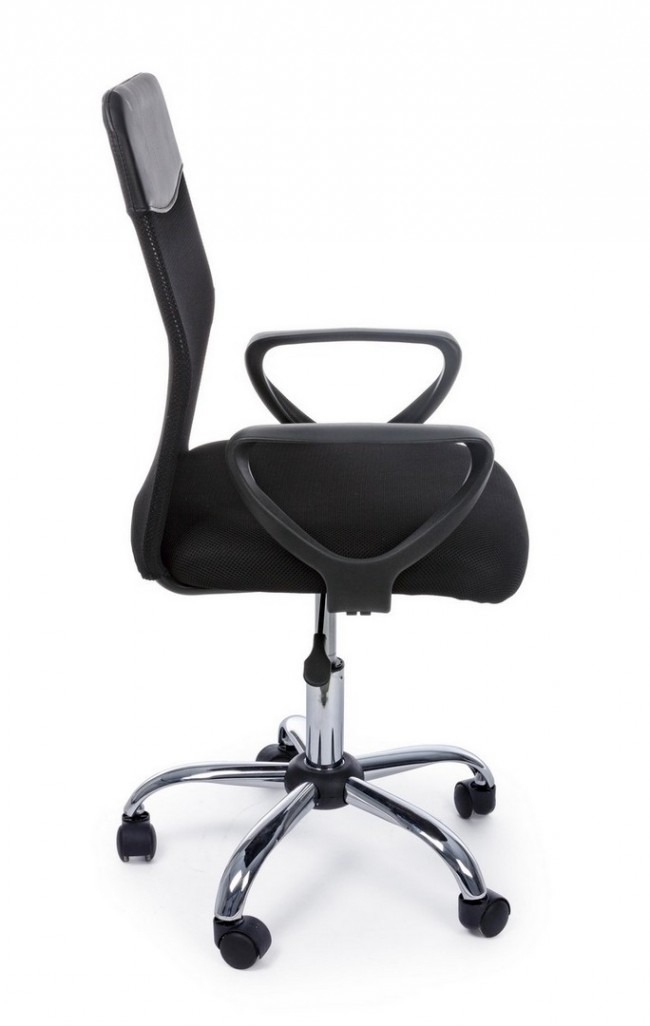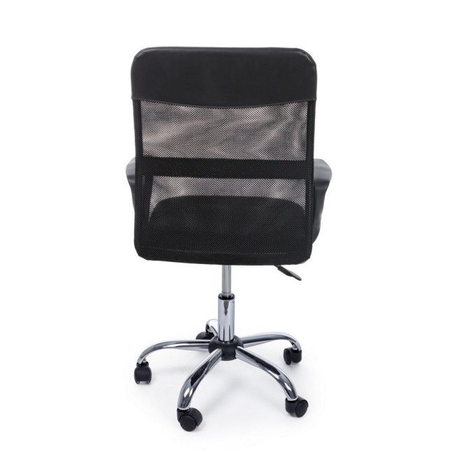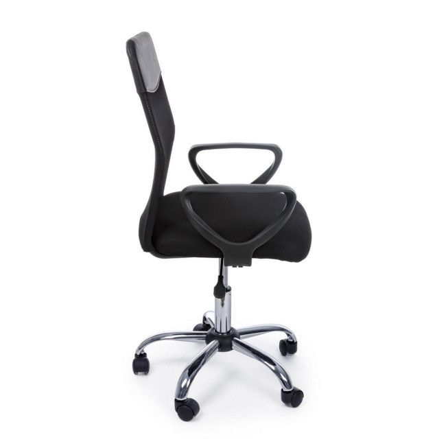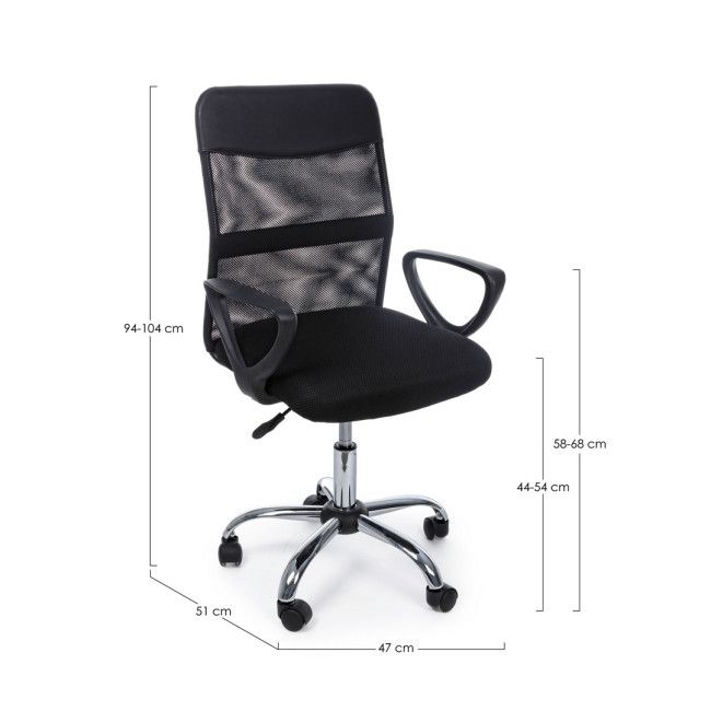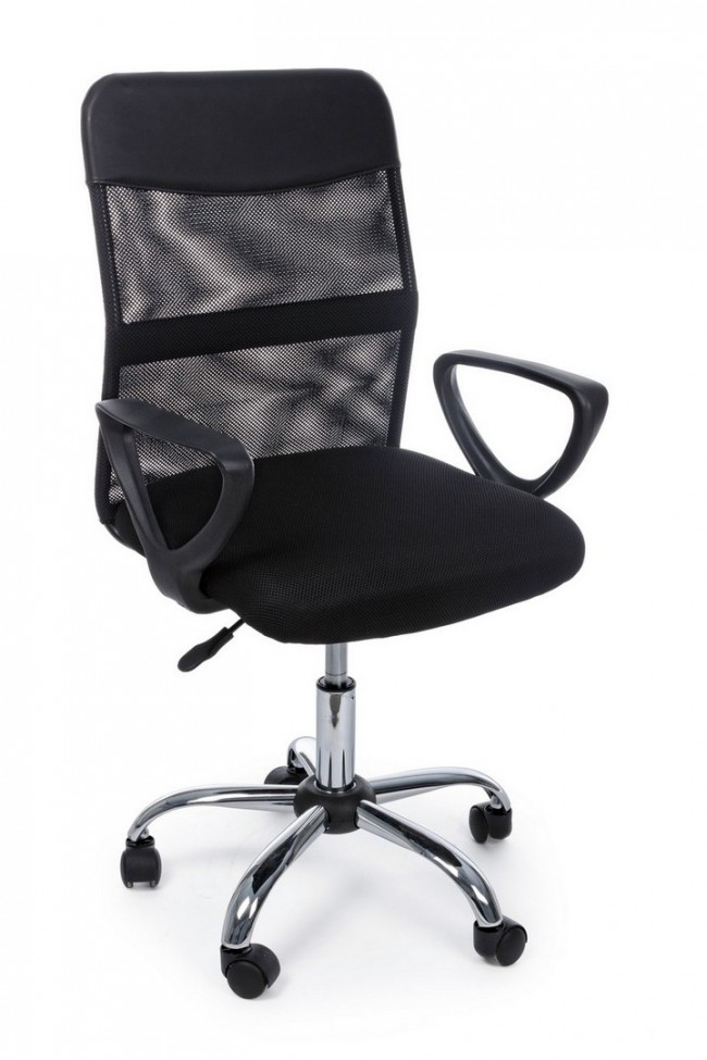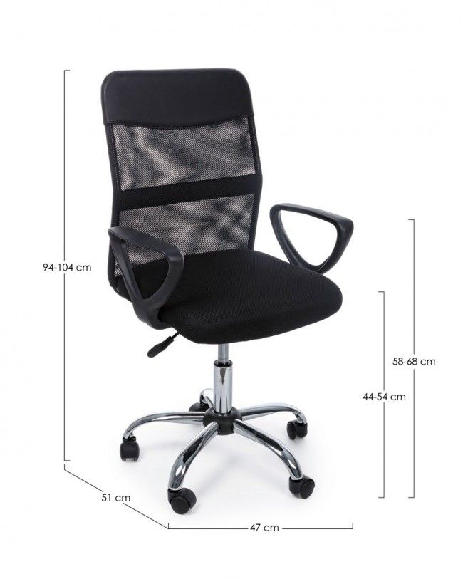 BASE IN ACCIAIO CROMATO √ò53CM. RUOTE IN NYLON. SEDUTA IMBOTTITA E RIVESTITA IN TESSUTO 100% POLIESTERE. SCHIENALE RIVESTITO IN TESSUTO A RETE 100% POLIESTERE CON INSERTO IN SIMILPELLE. BRACCIOLI IN PLASTICA (PP). ALTEZZA REGOLABILE. DA ASSEMBLARE