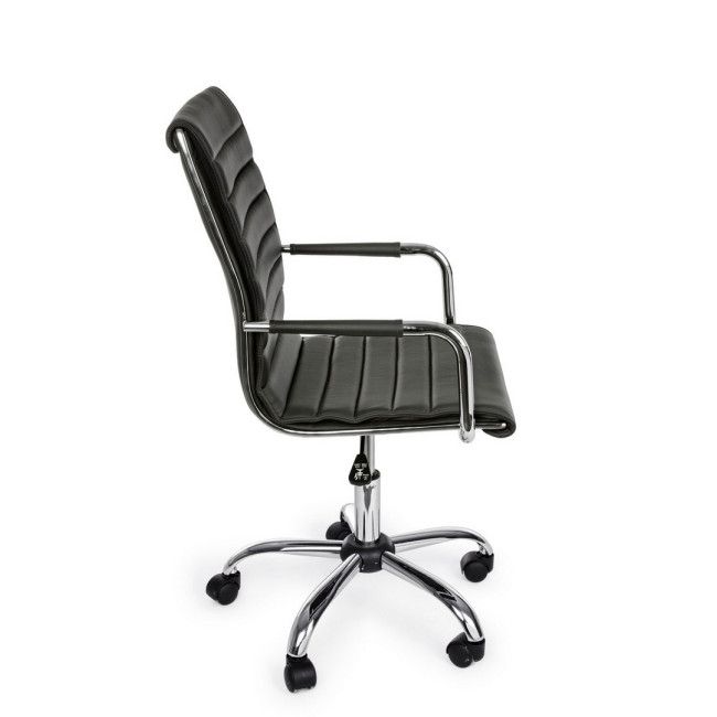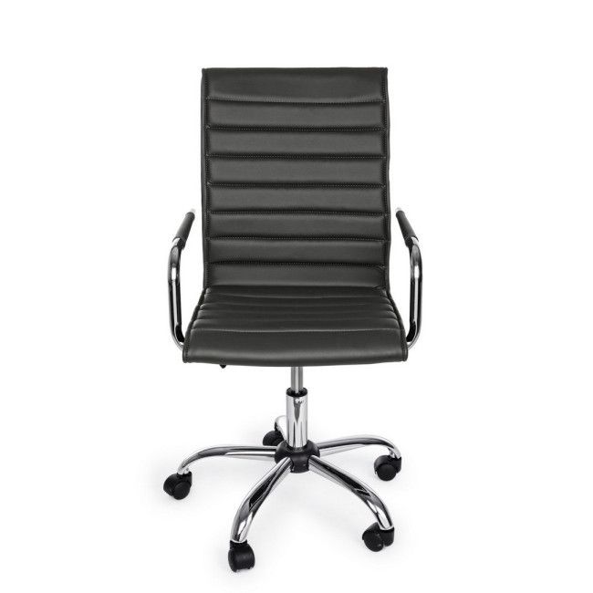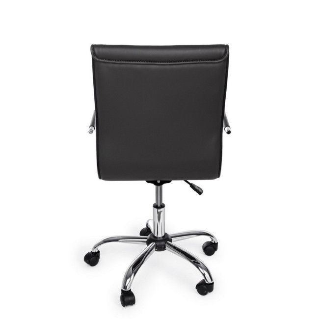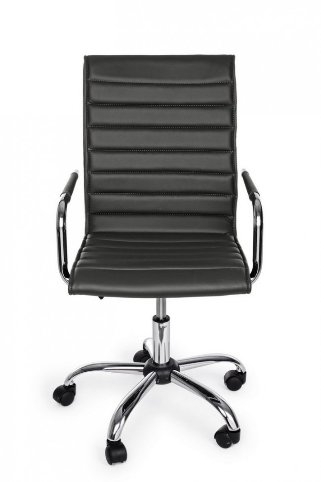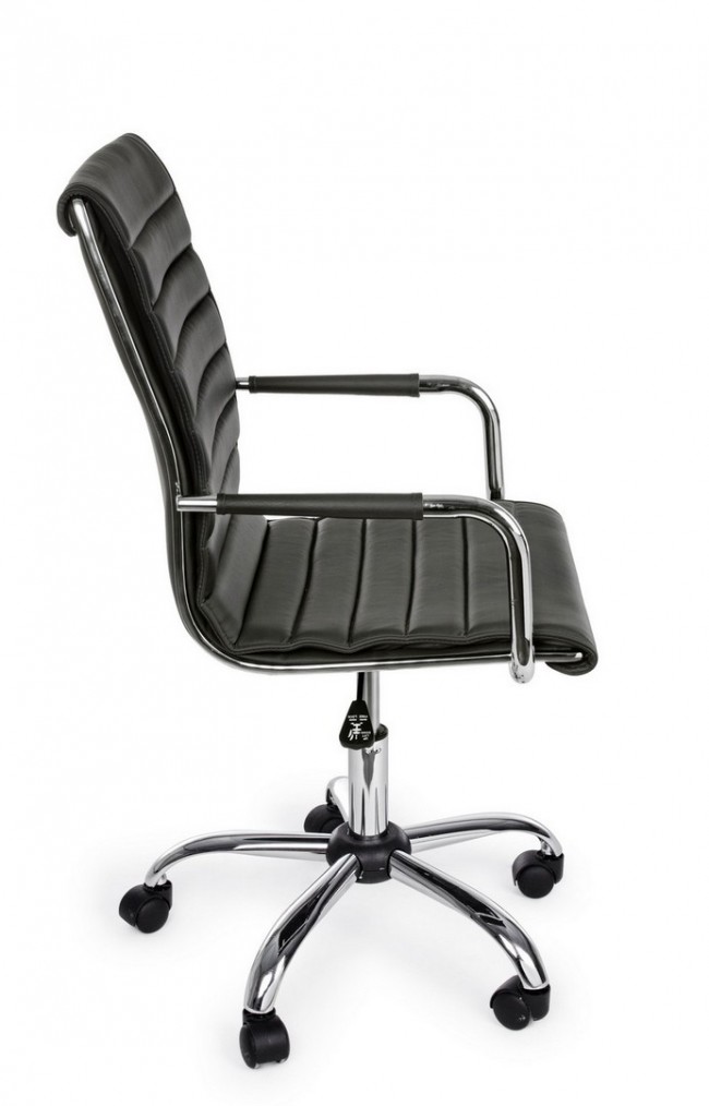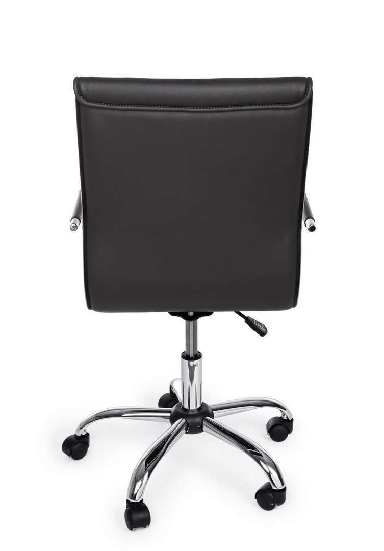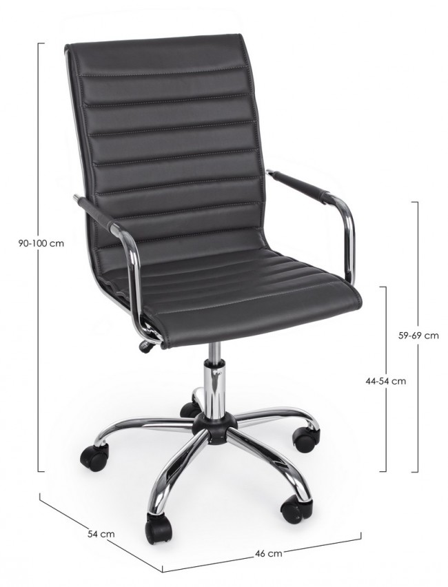 BASE IN ACCIAIO CROMATO √ò56 CM. RUOTE IN NYLON. SEDUTA E SCHIENALE IMBOTTITI E RIVESTITI IN SIMILPELLE. BRACCIOLI IN ACCIAIO CROMATO CON RIVESTIMENTO IN SIMILPELLE. ALTEZZA REGOLABILE. DA ASSEMBLARE