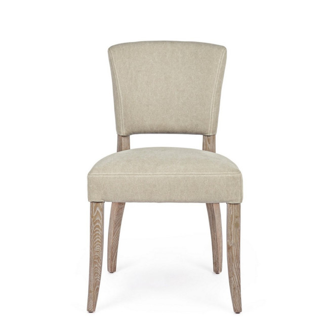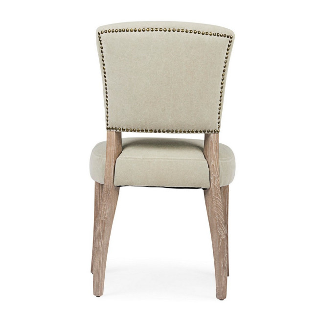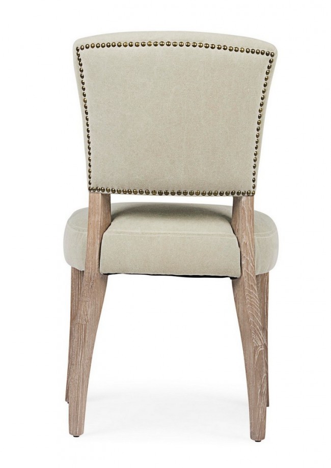 STRUTTURA IN LEGNO DI FRASSINO CON FINITURA A BASE DI NITROCELLULOSA, RIVESTIMENTO IN TESSUTO (15% POLIESTERE 85% COTONE). SCHIENALE CON APPLICAZIONE DI BORCHIE IN METALLO. IMBOTTITURA IN SCHIUMA POLIURETANICA DENSITA’ SEDUTA 30KG/M3, SCHIENALE 25KG/M3.