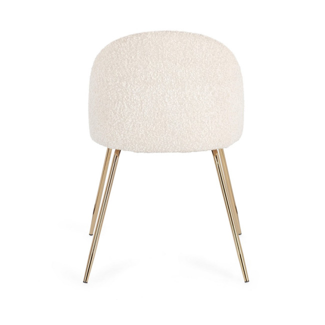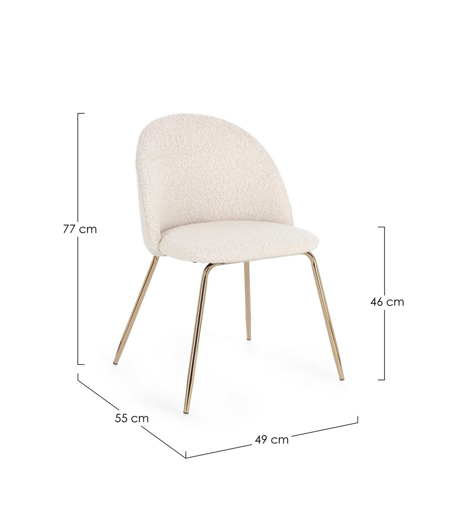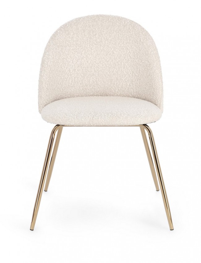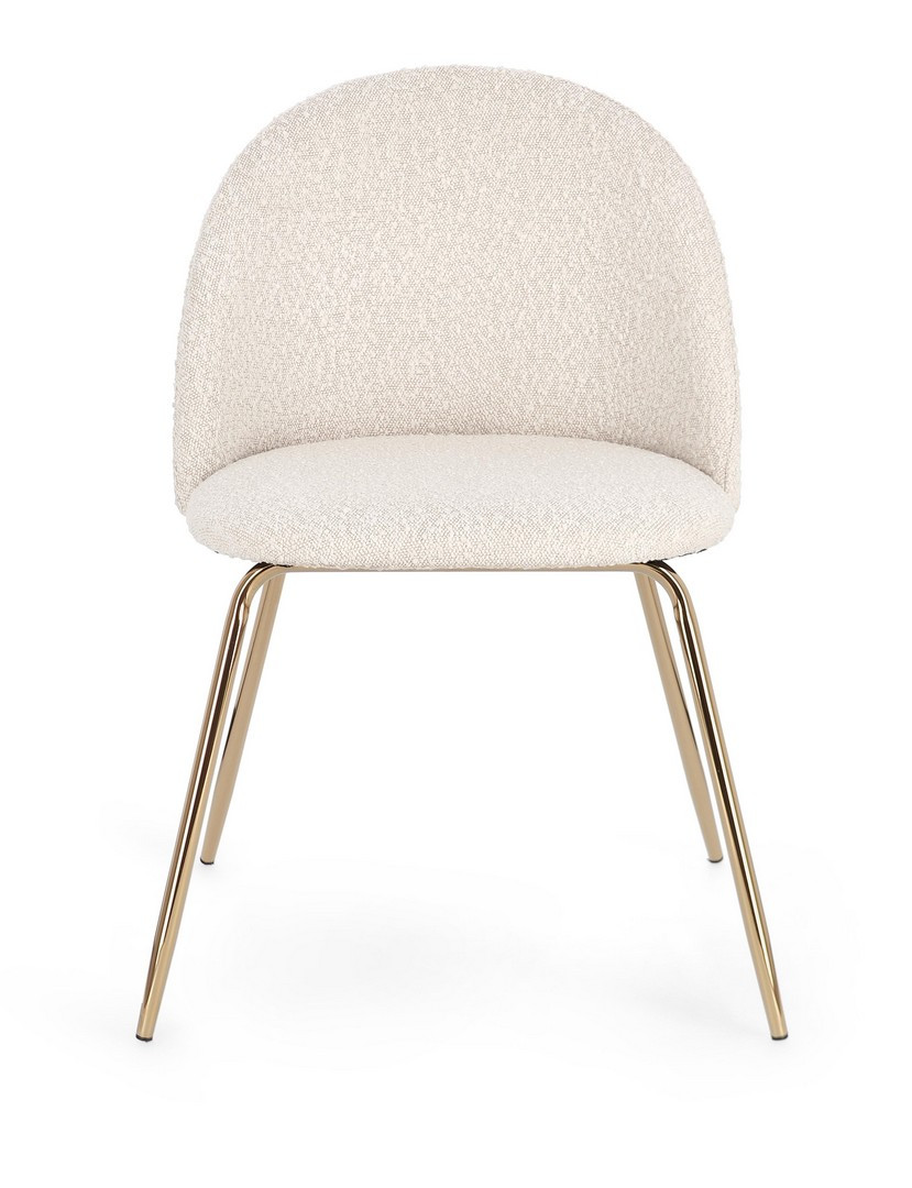 GAMBE IN TUBOLARE DI ACCIAIO CON CROMATURA DORATA. SCHIENALE E SEDUTA IMBOTTITI IN SCHIUMA POLIURETANICA E RIVESTITI IN 95% POLIESTERE 5% ACRILICO EFFETTO BOUCLE’. GAMBE DA ASSEMBLARE.