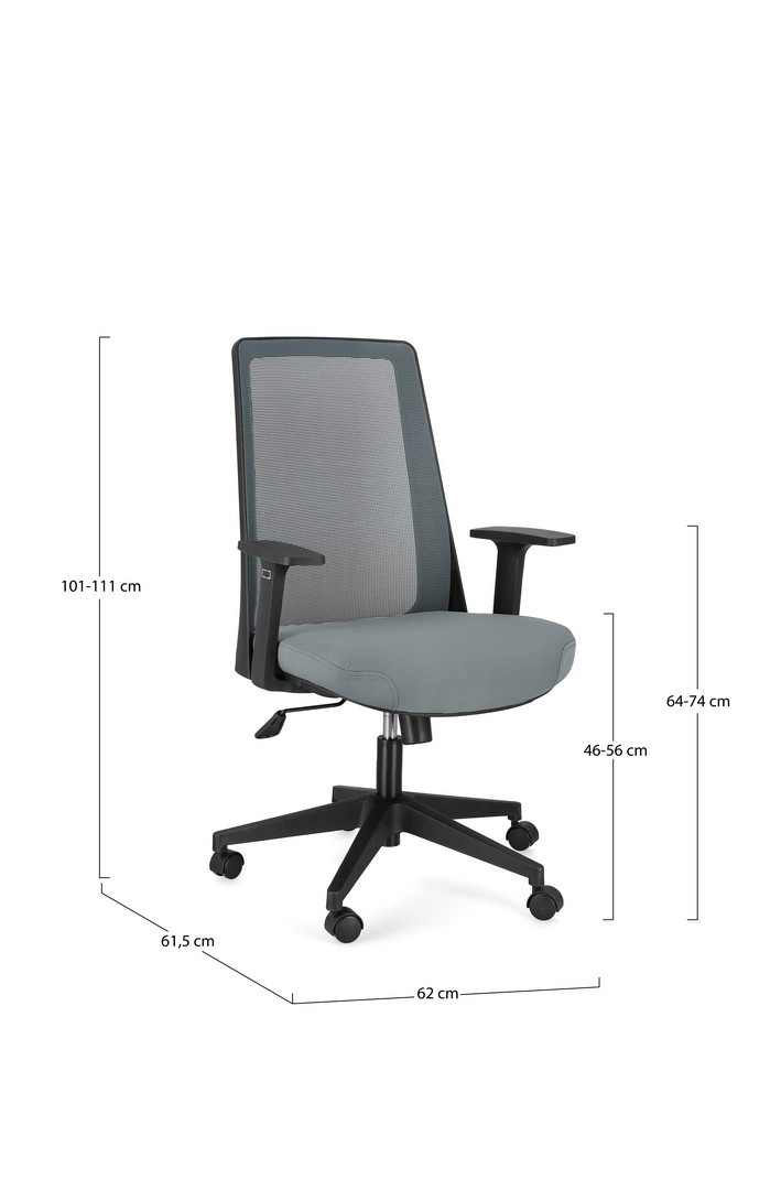 BASE IN NYLON √ò66 CM. RUOTE IN PLASTICA (PU). SEDUTA IMBOTTITA IN SCHIUMA POLIURETANICA E RIVESTITA IN TESSUTO A RETE POLIESTERE 100%. SCHIENALE IN PLASTICA (PP) RIVESTITO IN TESSUTO A RETE POLIESTERE 100%. ALTEZZA REGOLABILE. DA ASSEMBLARE.