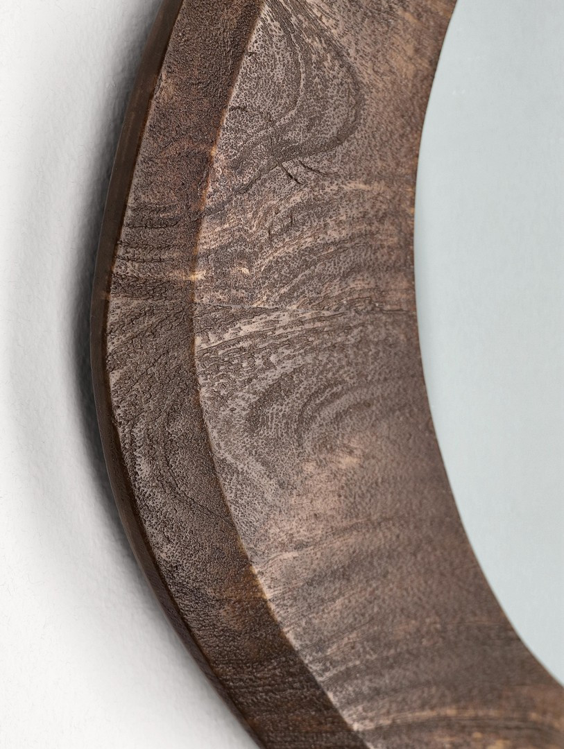 LEGNO DI MANGO FINITURA A BASE DI NITROCELLULOSA E VETRO.MISURA SPECCHIO:√ò32CM