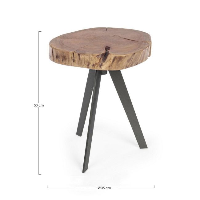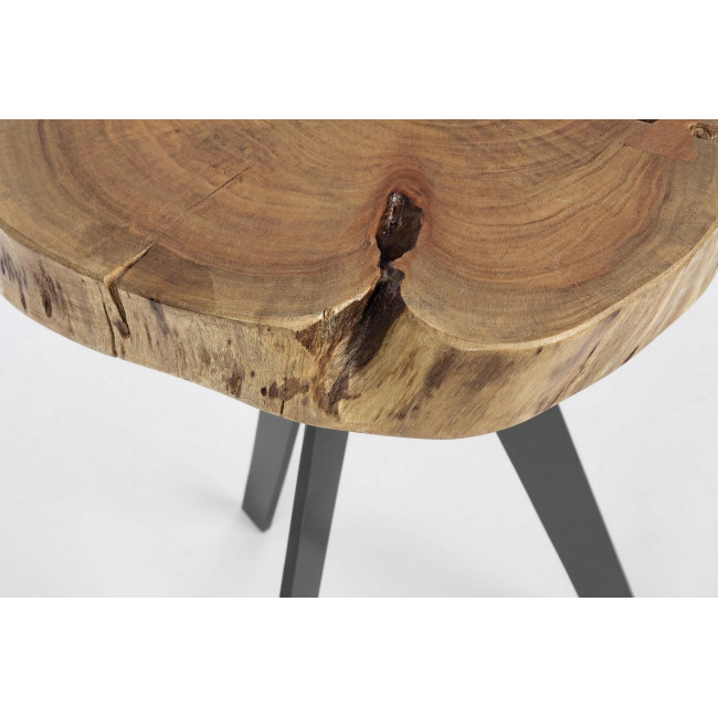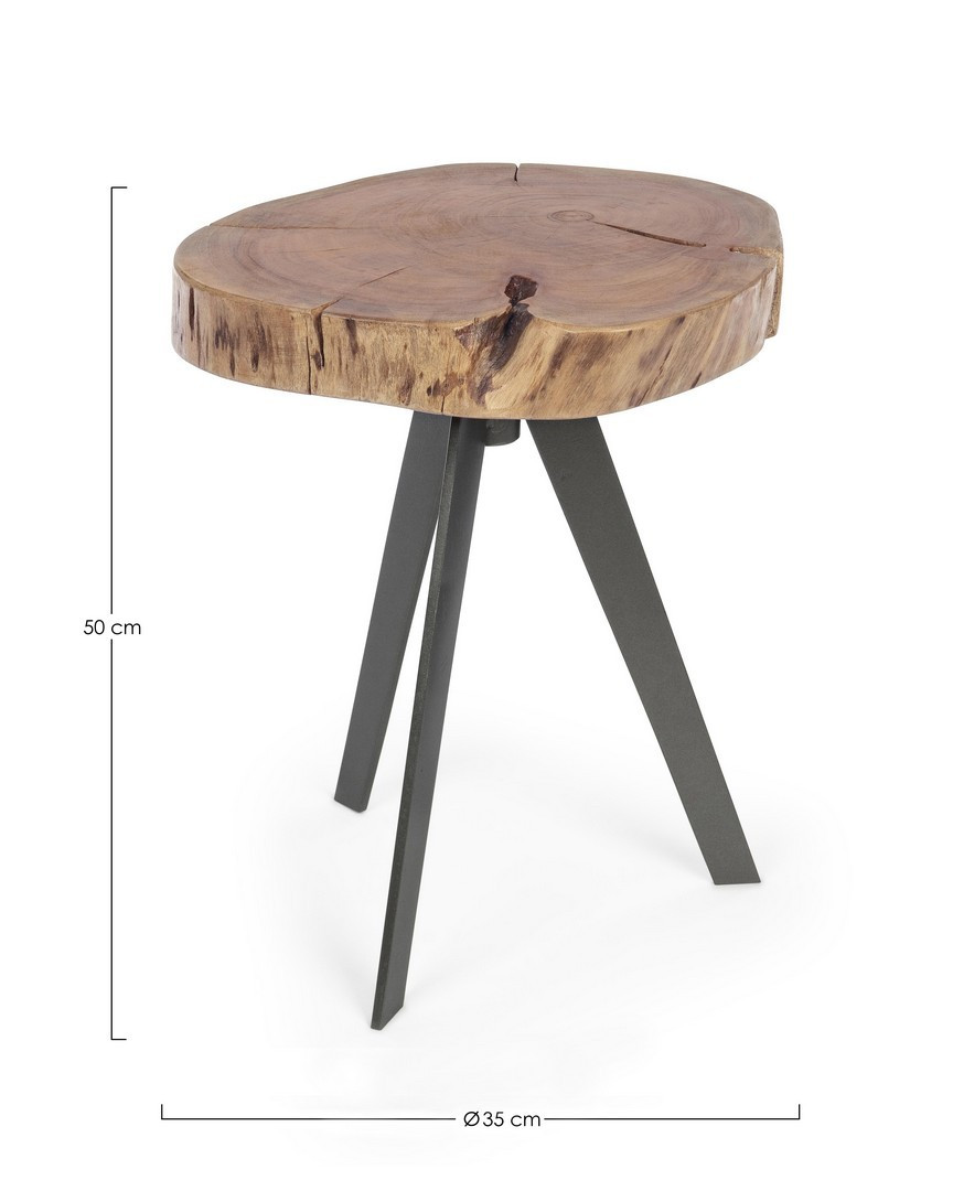 PIANO IN LEGNO D’ACACIA (SEZIONI ORIGINALI DI TRONCO), GAMBE IN ACCIAIO VERNICIATO A POLVERE EPOSSIDICA. FINITURA A BASE DI VERNICE POLIURETANICA. LE FORME E LE MISURE CREATE DAL LEGNO SONO SOLO INDICATIVE. TUTTI I PRODOTTI SARANNO DIVERSI L’UNO DALL’ALTRO.