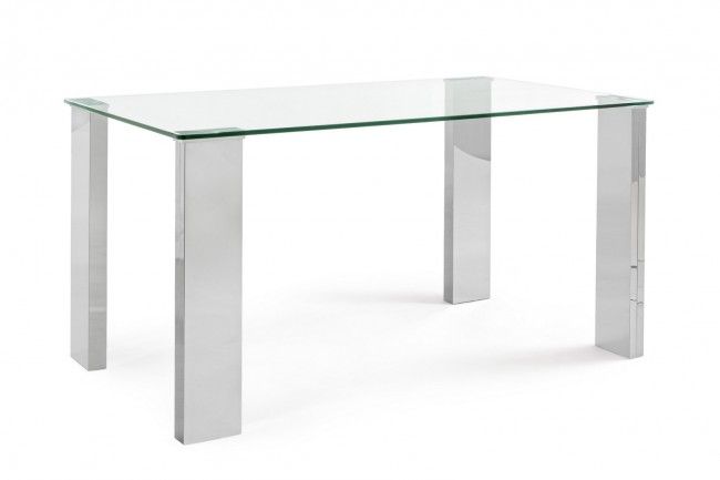 GAMBE IN MDF RIVESTITE CON LAMINA IN ACCIAIO LUCIDO SPESSORE 0.3MM. PIANO IN VETRO TEMPERATO SPESSORE 12MM. GAMBE DA ASSEMBLARE.