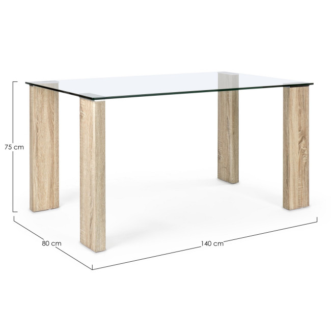 GAMBE IN MDF RIVESTITE CON CARTA MELAMINICA EFFETTO LEGNO. PIANO IN VETRO TEMPERATO SPESSORE 12MM. GAMBE DA ASSEMBLARE.