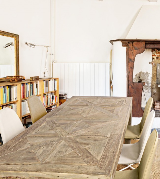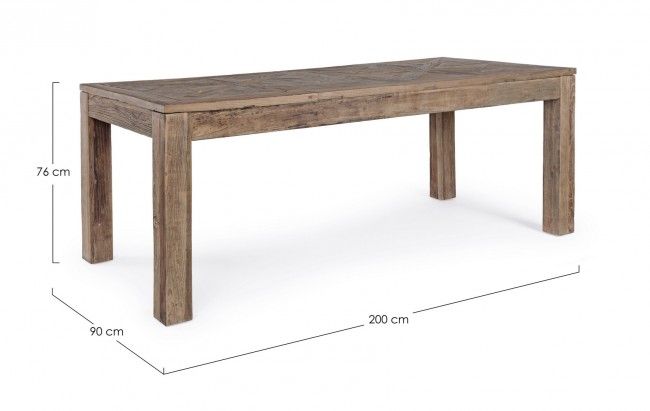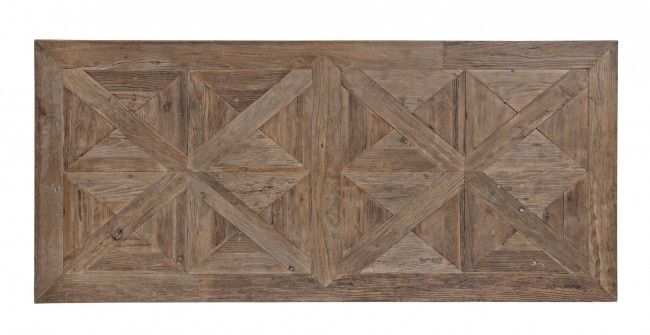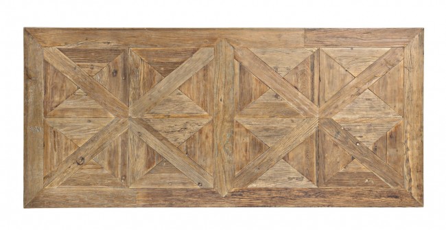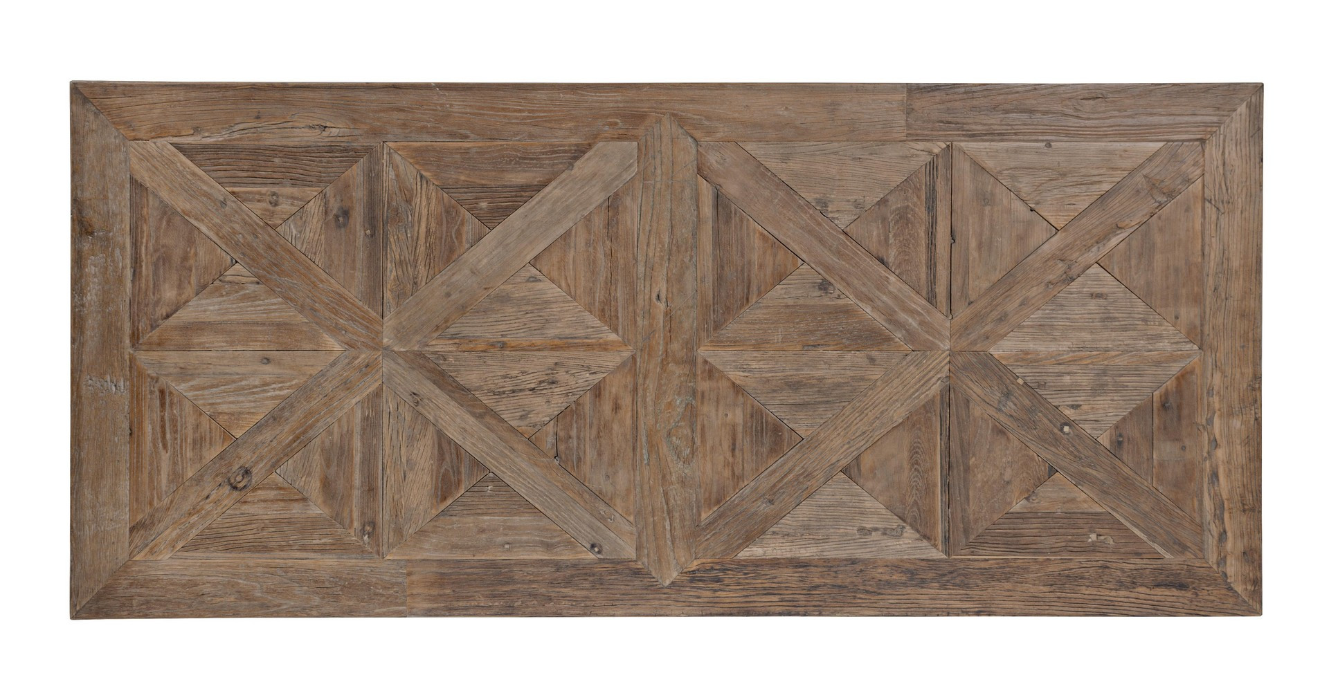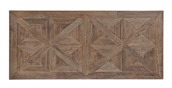 LEGNO DI OLMO RICICLATO, PIANO CON LAVORAZIONE ANTICATA A PARQUET. FINITURA A BASE DI NITROCELLULOSA. GAMBE DA ASSEMBLARE.